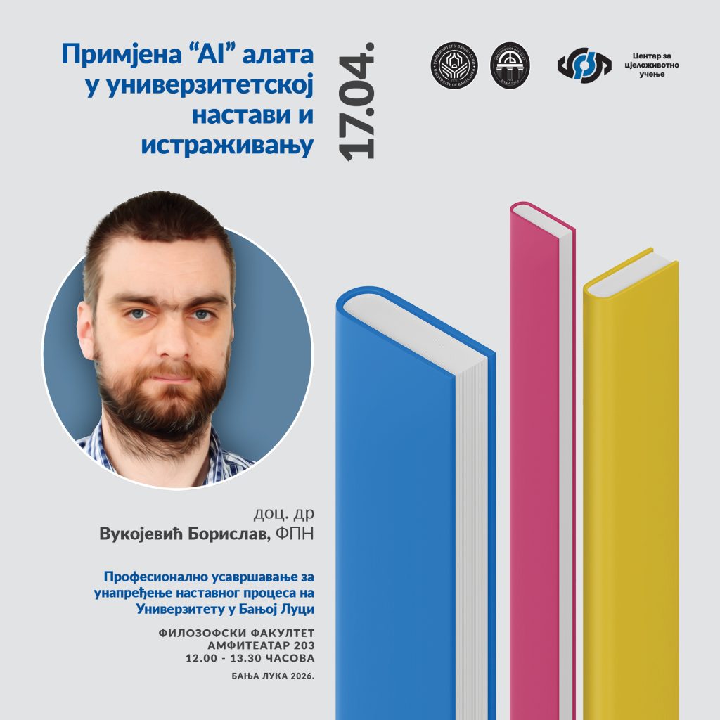 Да ли сте спремни да унаприједите наставу уз помоћ вјештачке интелигенције? Филозофски факултет Универзитета у Бањој Луци наставља серију предавања у оквиру Програма професионалног усавршавања за унапређење наставног процеса, који има за циљ оснаживање наставног особља и развој савремених наставничких компетенција . Овог пута имамо част да угостимо колегу доц. др Борислава Вукојевића (ФПН)са предавањем: